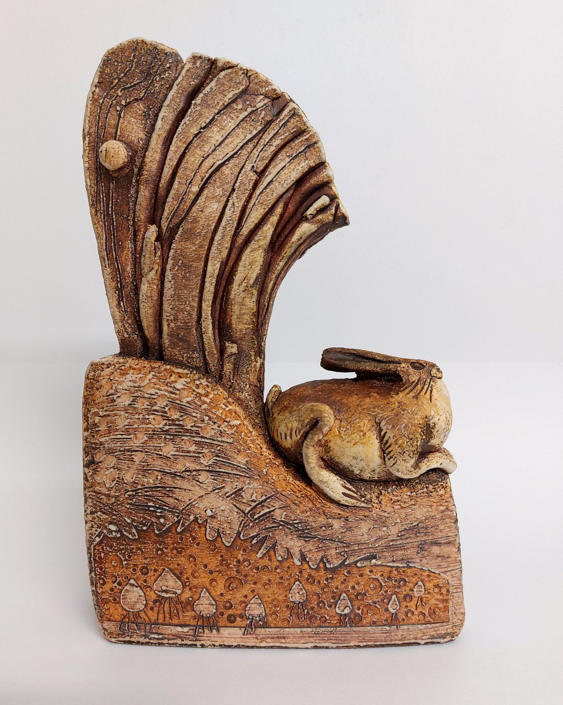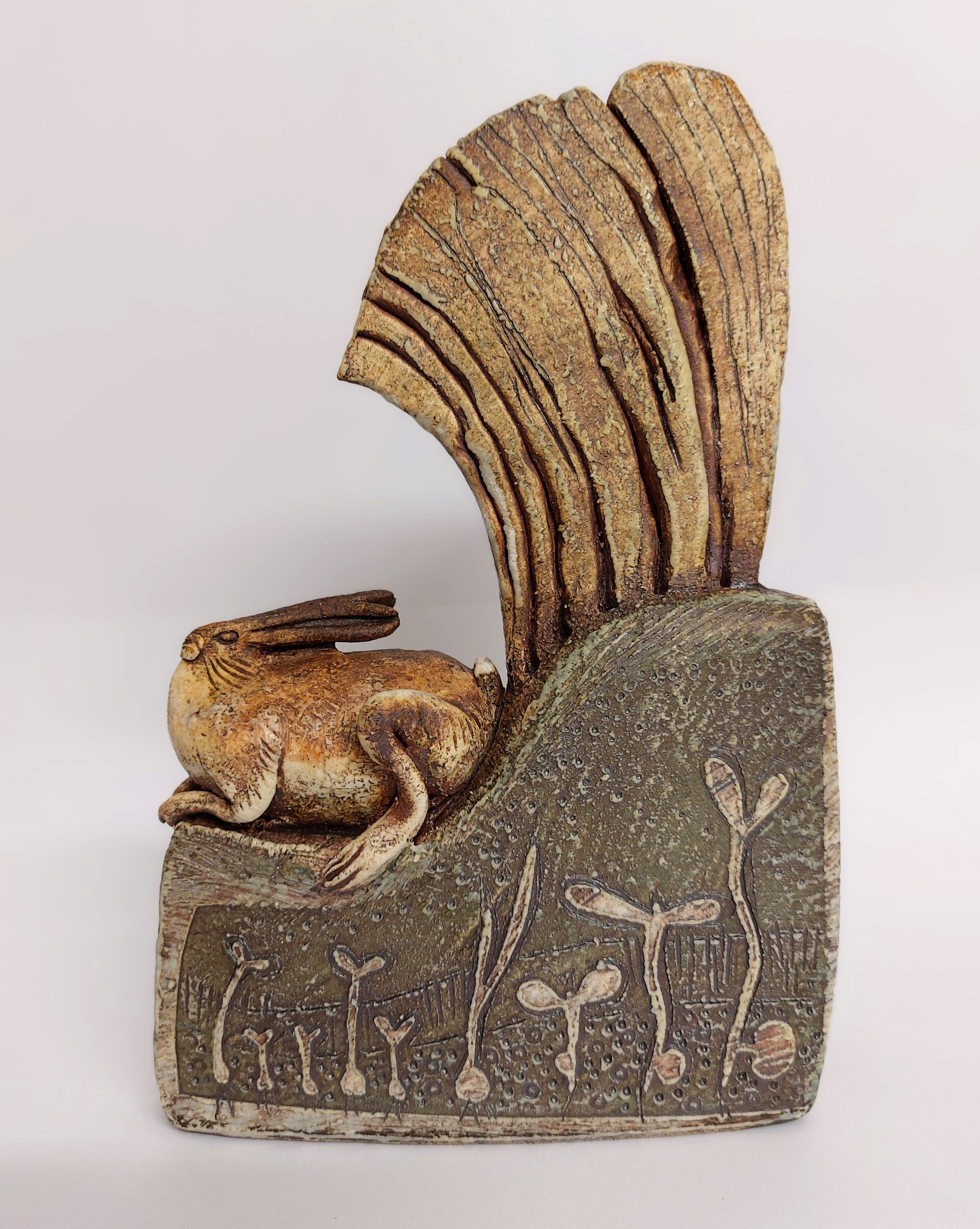 Hand built slabbed stoneware form, hand carved and formed, with coloured slips and oxides.