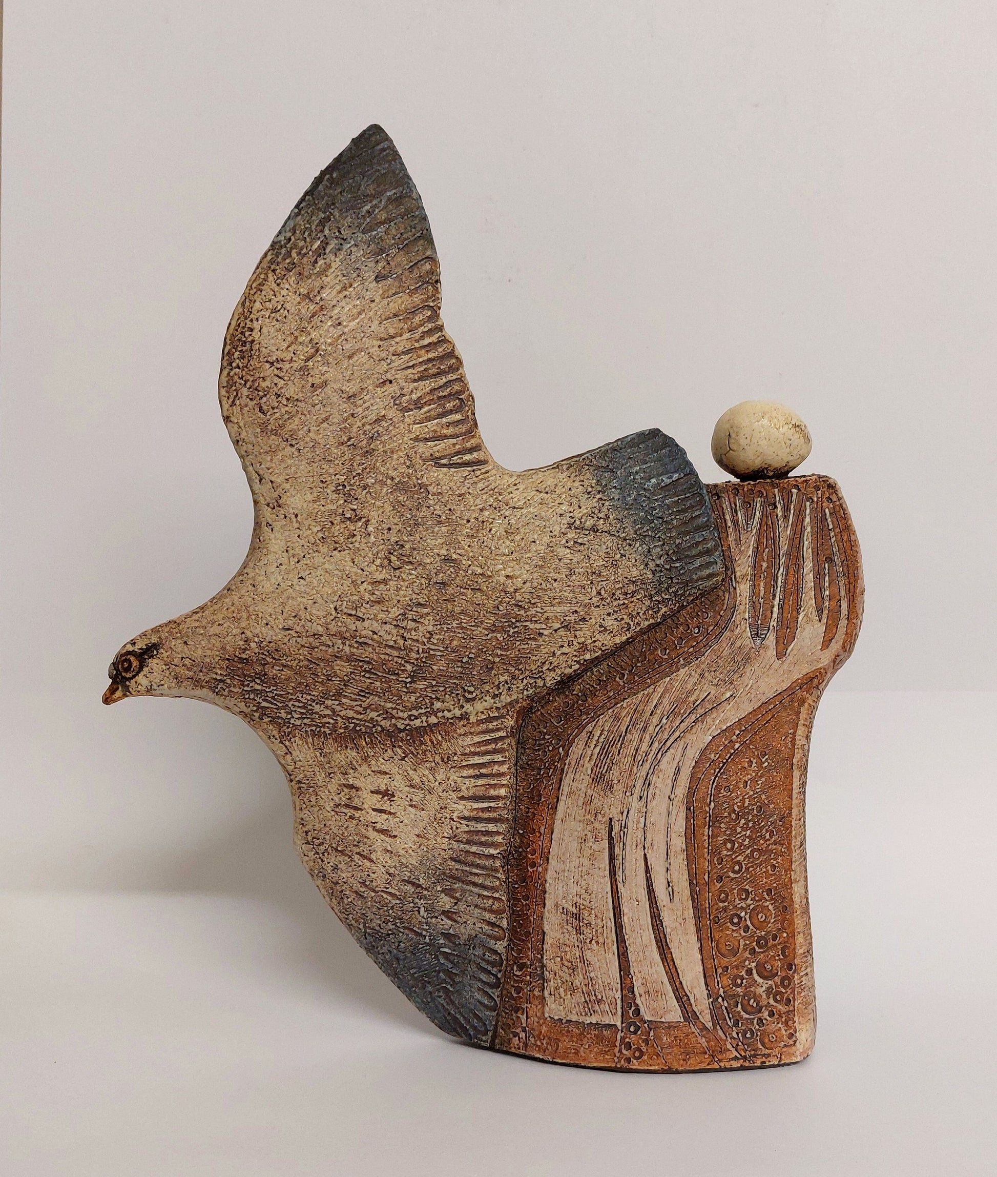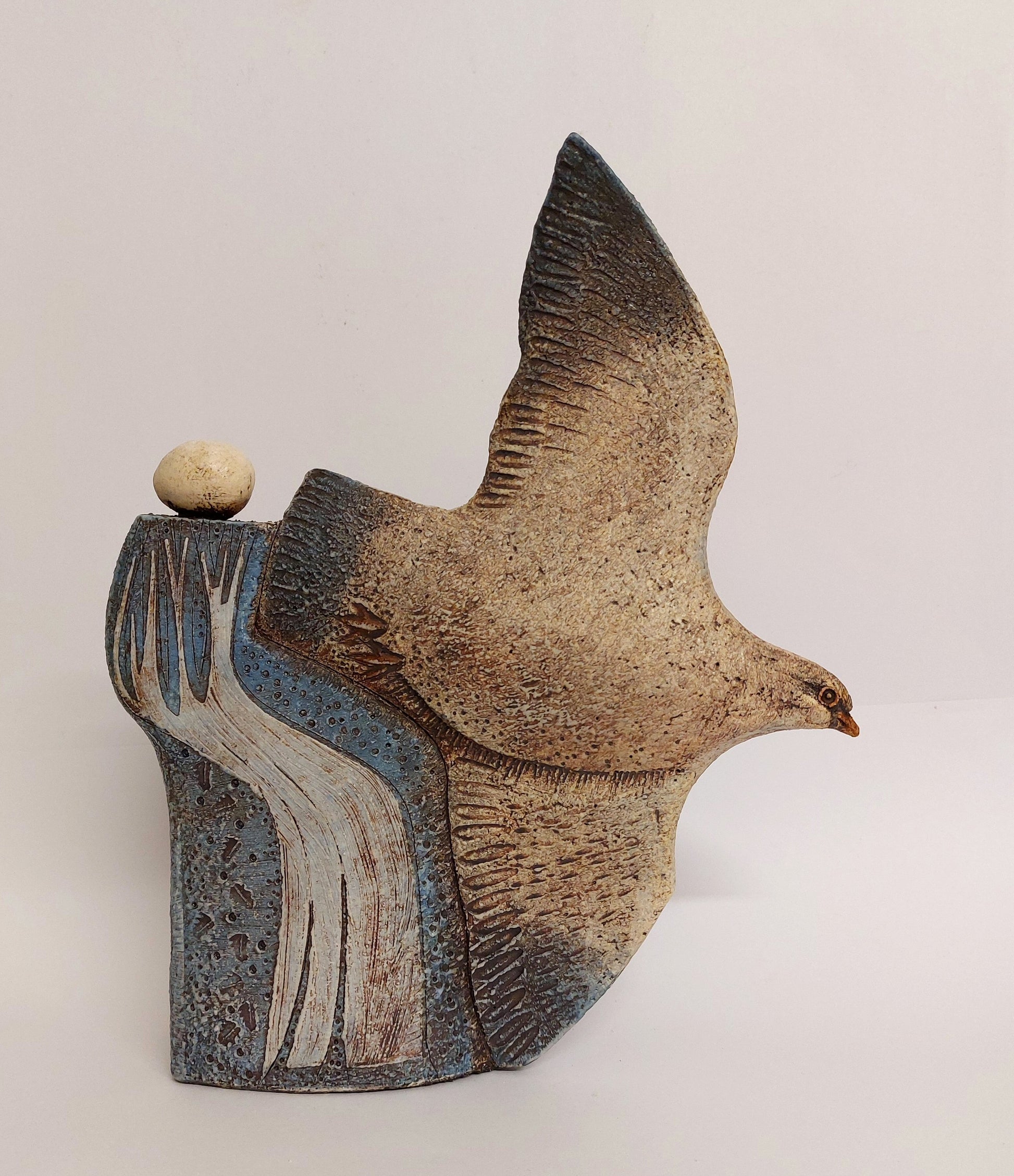 Hand built slabbed stoneware form, hand carved and formed, with coloured slips and oxides.