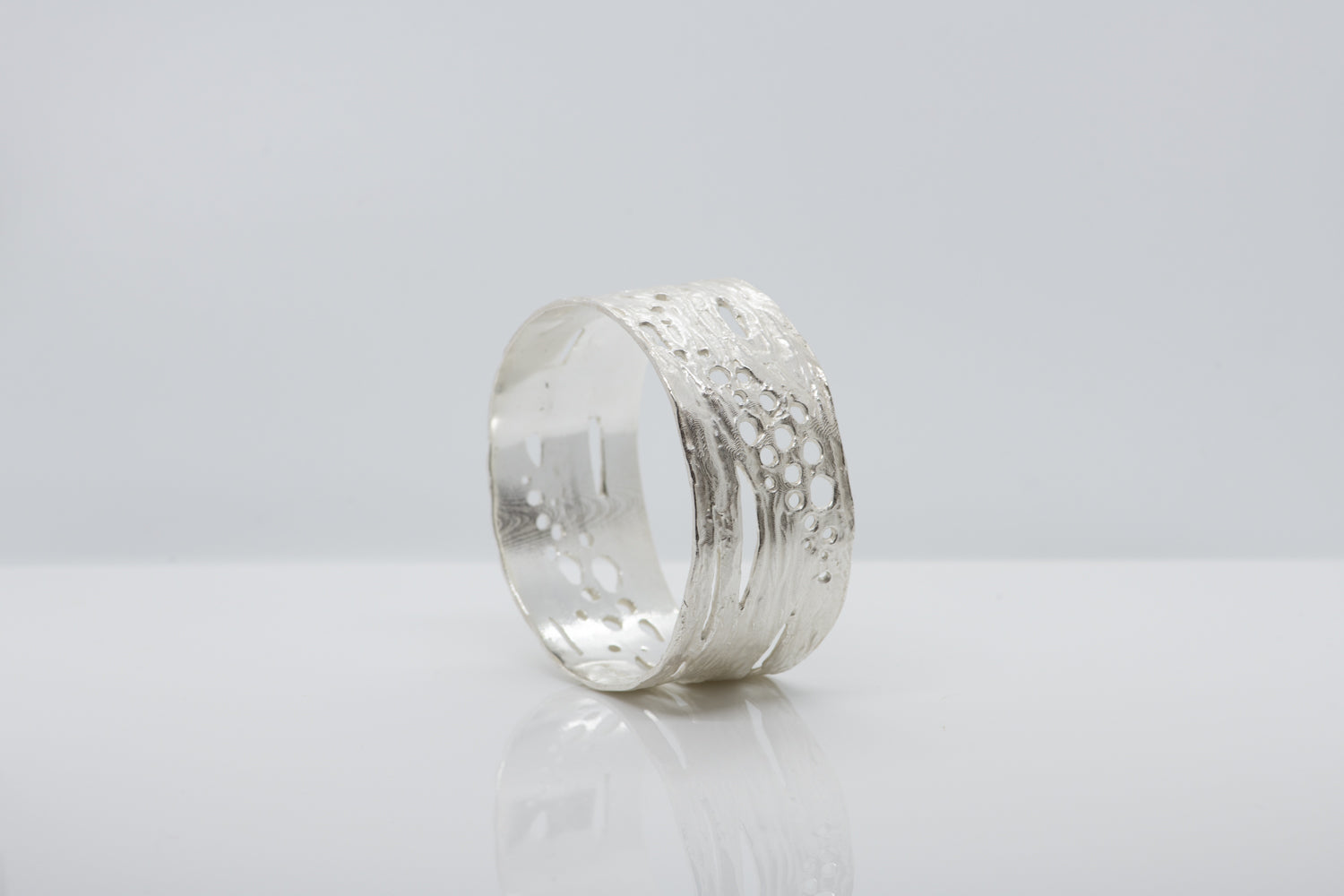 This bangle is cast in recycled silver from honey fungus, giving them a very organic texture.