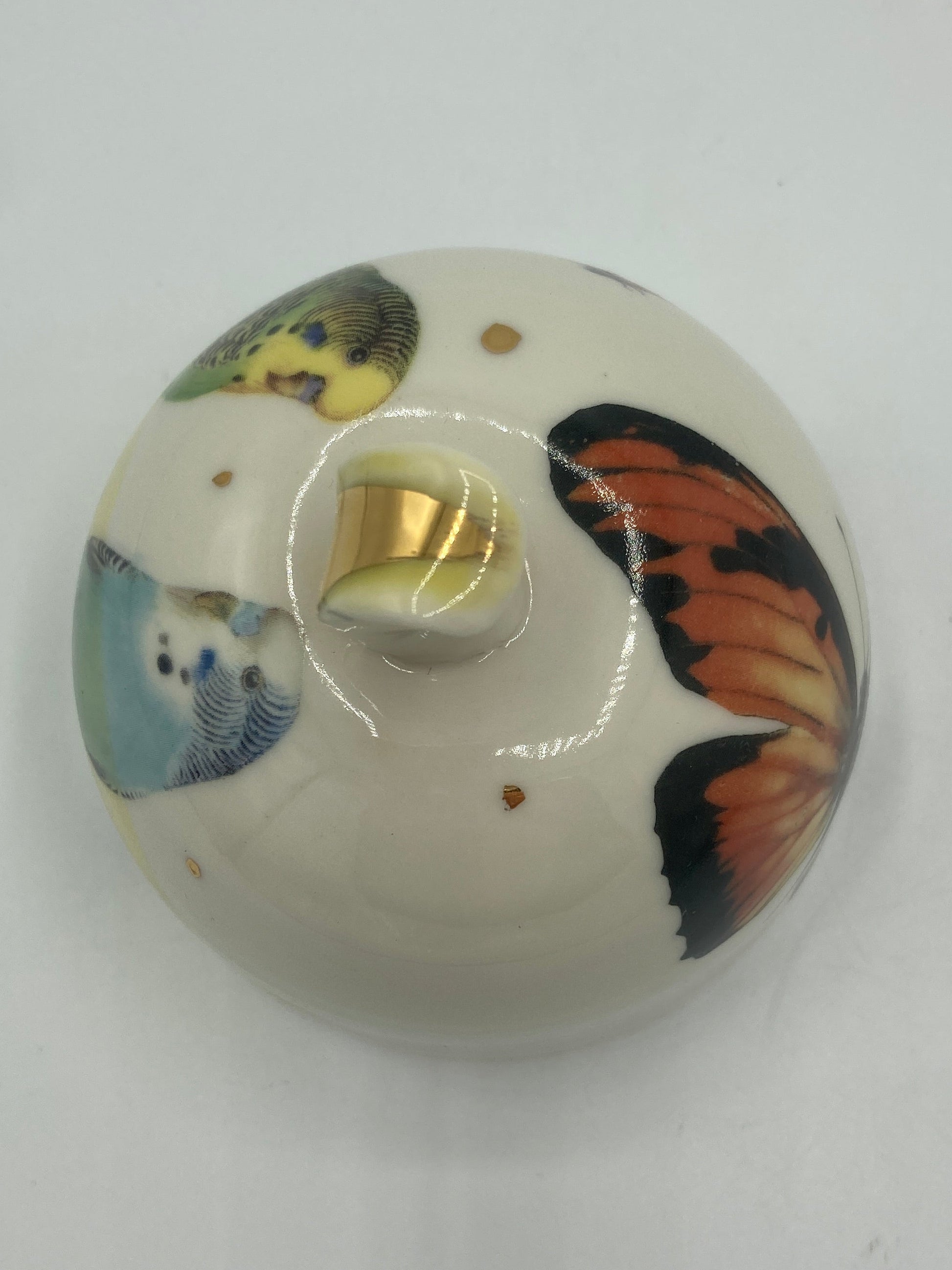 This butter dish is made from porcelain and finished with clear and coloured glazes. Helen creates pieces which can be used and enjoyed everyday. The forms are hand-thrown on a potters wheel and the surfaces treated with layered oxides, decals, slips and imprints, making each piece unique.
