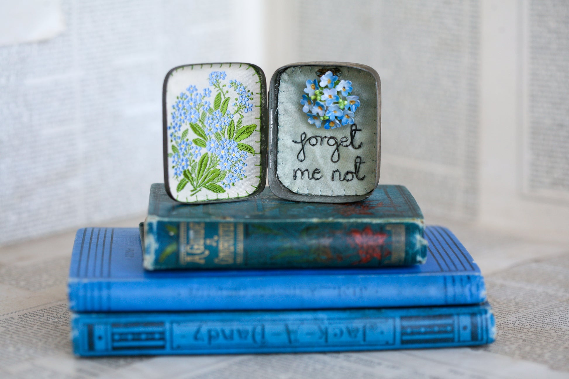 A darling little keepsake storybox. This is set in side a baby blue vintage 1930's boots tin. The inside lid is lined with a 1920's Kensitas woven silk forget me not. Inside the main body is a stunning Victorian carved and hand-painted bovine bone forget me not posy. This sits on a fragment of Georgian satin silk from the early 1800's, originally from a quilt. The words 'forget me not' are sculpted from wire and sewn on.