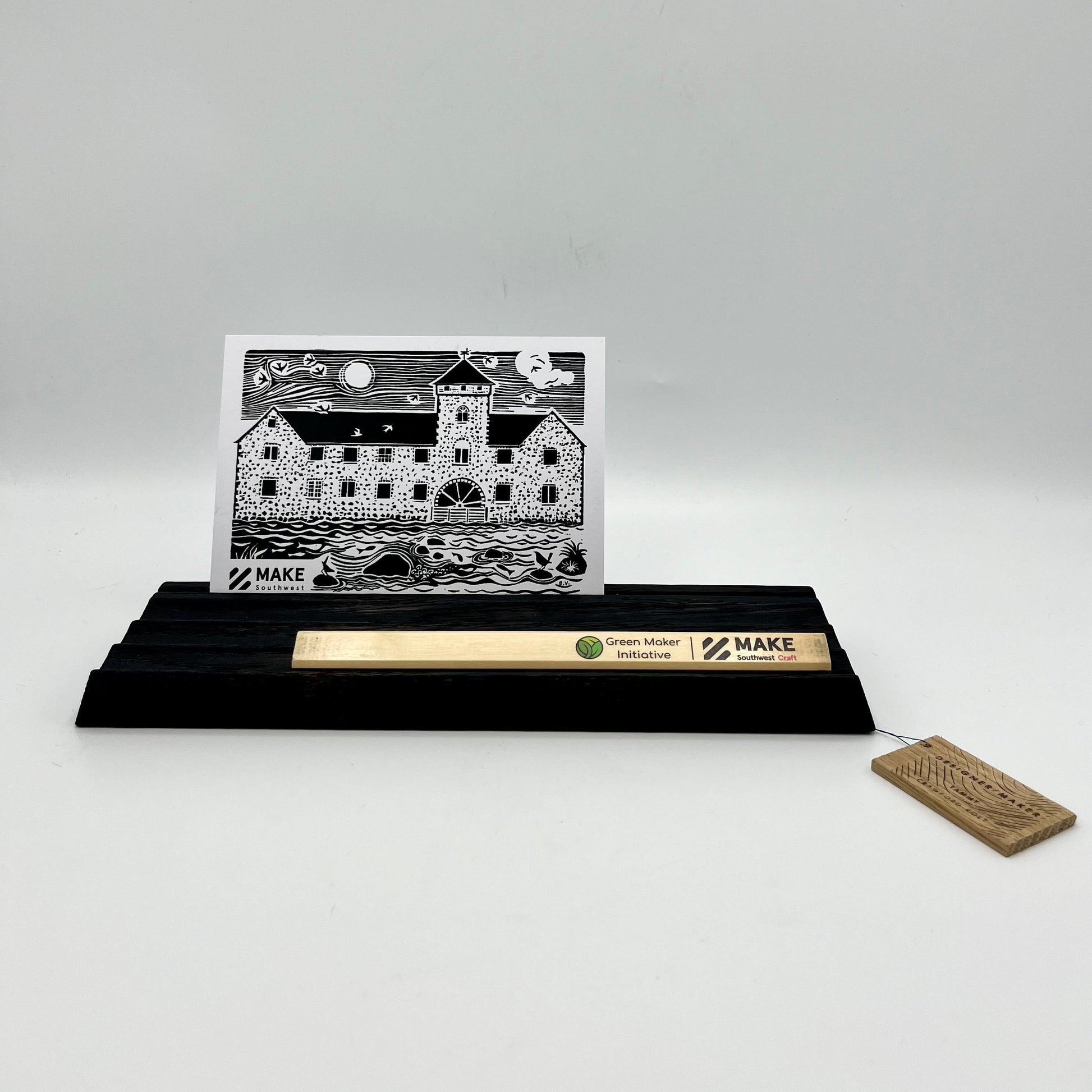 Pencil and card trays designed to place on your desk. Holds up to three pens/pencils/brushes in fluted grooves and a 3mm groove along the back for displaying a card. Oiled with a natural oil/wax finish.