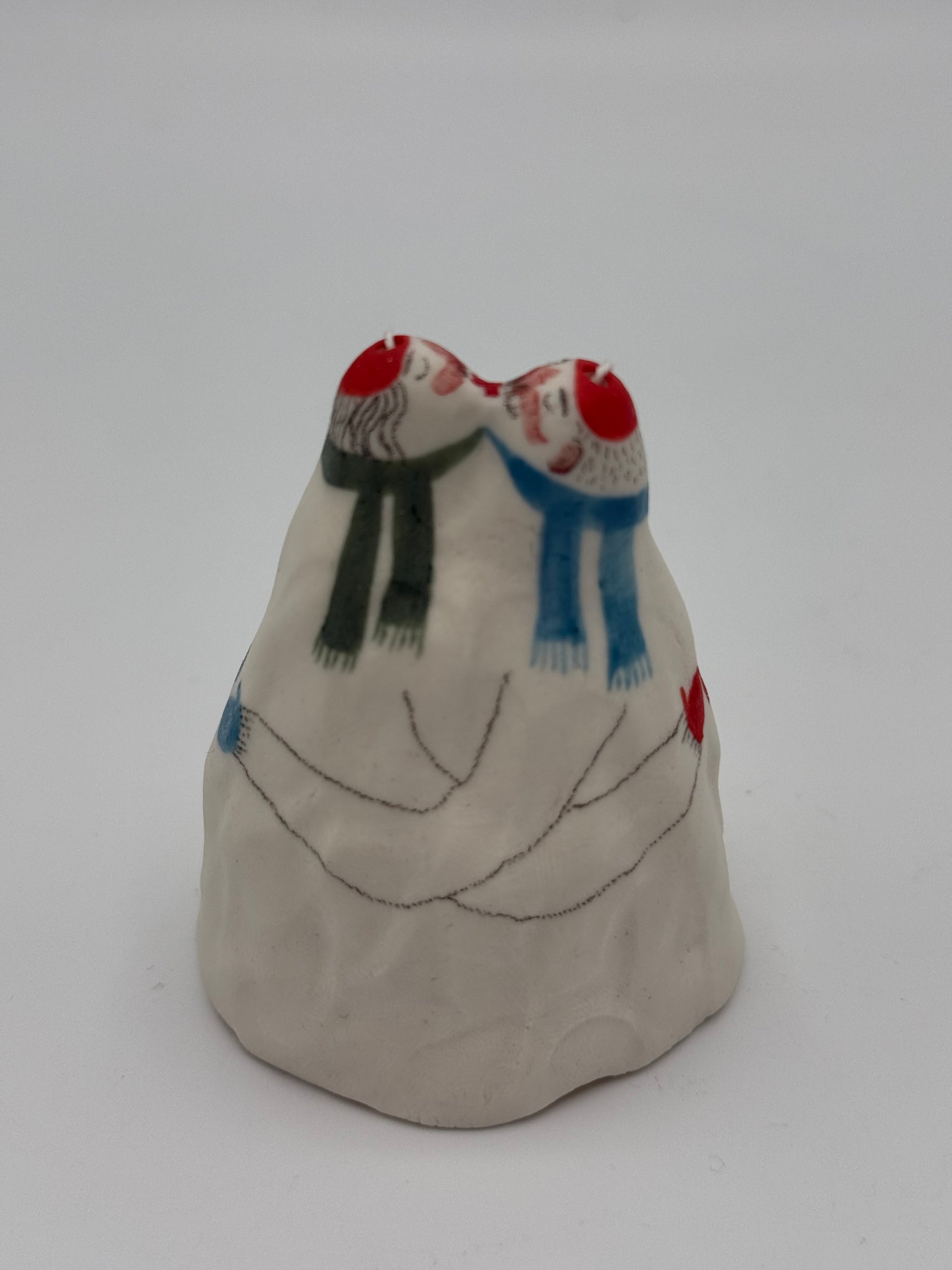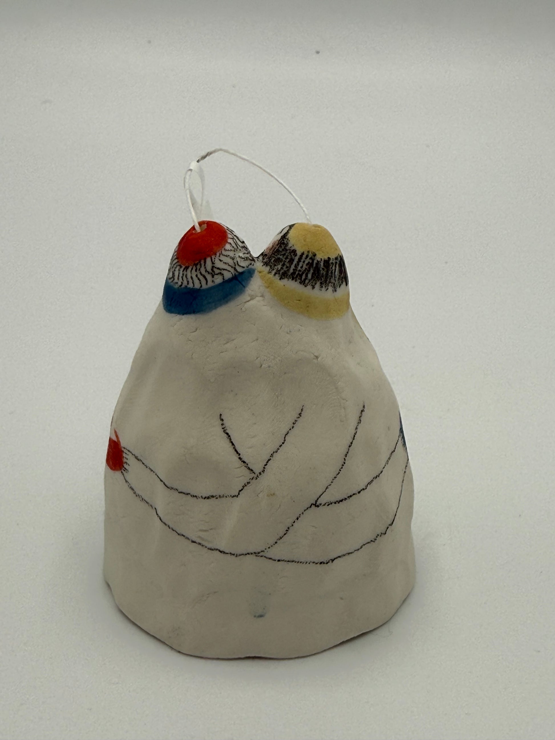 Pinched porcelain bauble with porcelain bead inside to jingle. Hung on strong linen thread and decorated with underglazes.